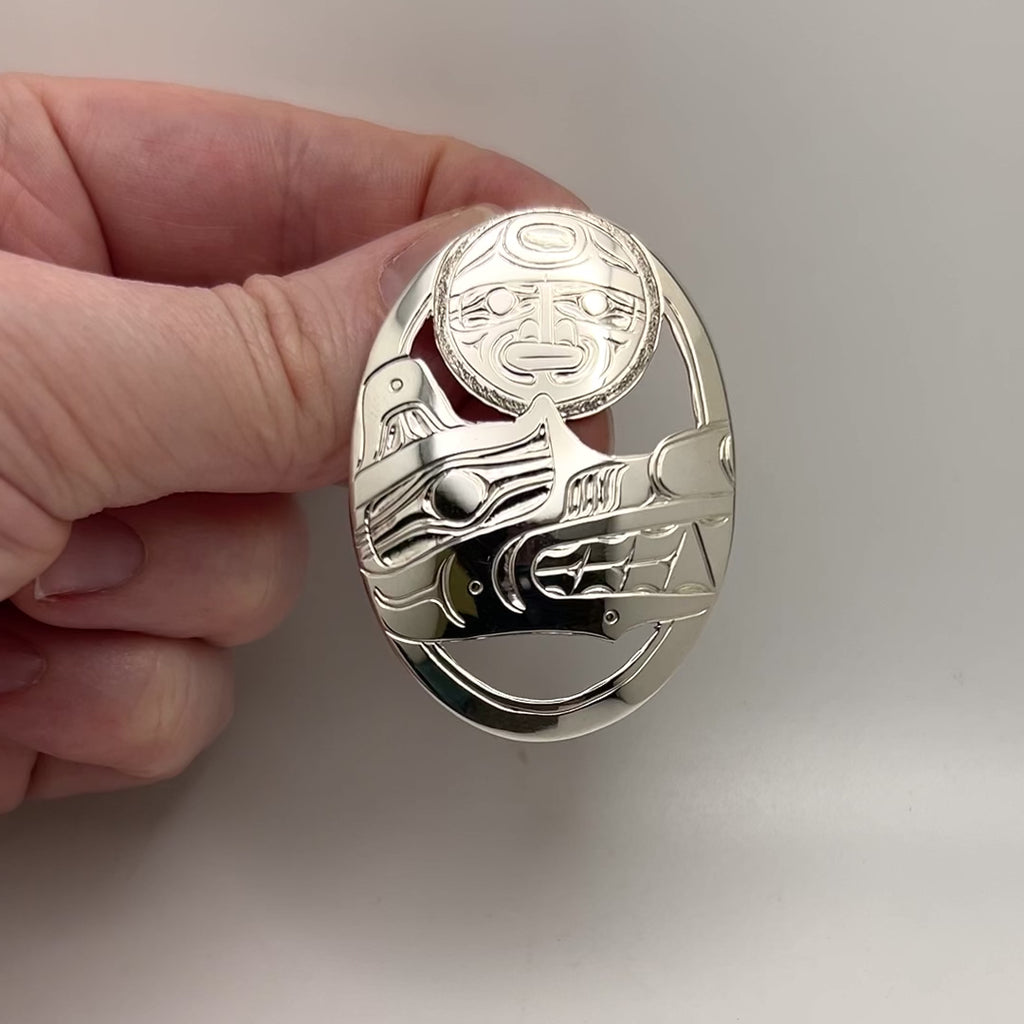 The Moon is seen in Northwest Coast mythology as a guardian and protector of the people, one of the most powerful beings. He acts as guide, and timekeeper, giving good luck and abundance to the people. The moon is often seen in a Ravens mouth which depicts a creation myth where the Raven releases the sun, moon, and stars into the sky. An eclipse is said to be a Codfish trying to swallow the moon.