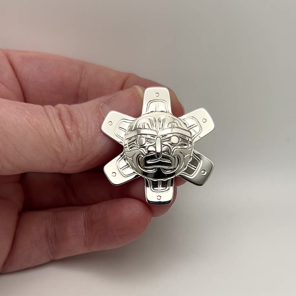 The Sun represents abundance, life, healing, and warmth. Released from a box by the Raven, the Sun Chief inhabits the sky and could only be reached by climbing a chain of arrows. The Sun is often carved on totems and masks and sits atop the tallest totem pole.